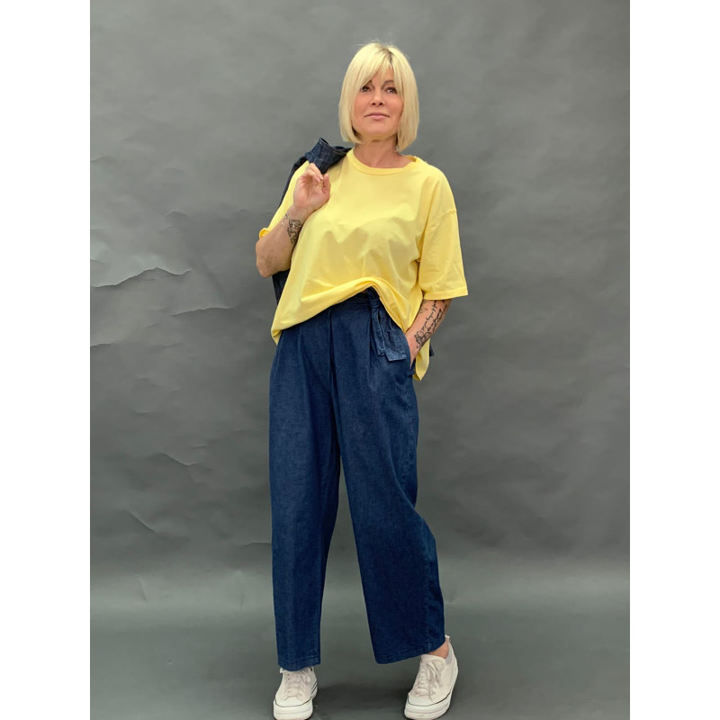 Легкі джинси з полегшеного деніму на запах, що дозволяє регеулювати їх в об"ємі талії. Пояс ззаду на резинці і зав"язується на таліїї. Штанина пряма , класична посадка. У бічних швах кишені. Довжина 100 см