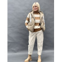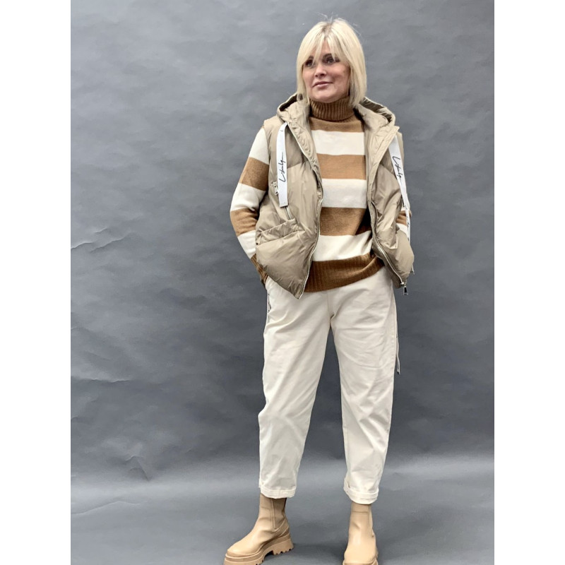 MOM JEANS – модний крій джинсів цього сезону. Стандартний крій на рівні ременя, косі кишені, складки спереду, резинка на поясі ззаду. Джинси вільні по нозі, штанів манжета доповнює картину.