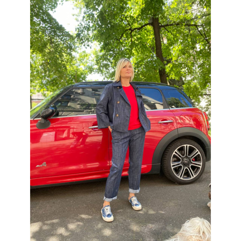 Прямі джинси з потертостями з косими кишенями у бічних швах та накладними кишенями позаду