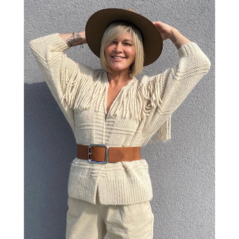 Цей об"ємний в"язаний кардиган несе тепло ручної в"язки з бахрамою спереду та позаду, надає шарму та привабливості