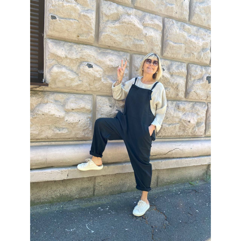 Дуже привабливий льняний комбінезон з великими кишенями та широкими штанинами відрізний трохи нижче по талії