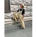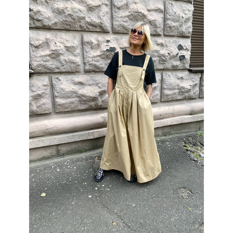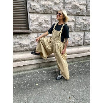 Оригінальний та комфортний комбінезон з попліну який створює молодий споортивний невимушений образ . Спереду оформлені 4 зустрічні складкки довжина бретелів регулюється петлями під гудзики косі кишені збоку вшиті гумки можуть регулювати талію.