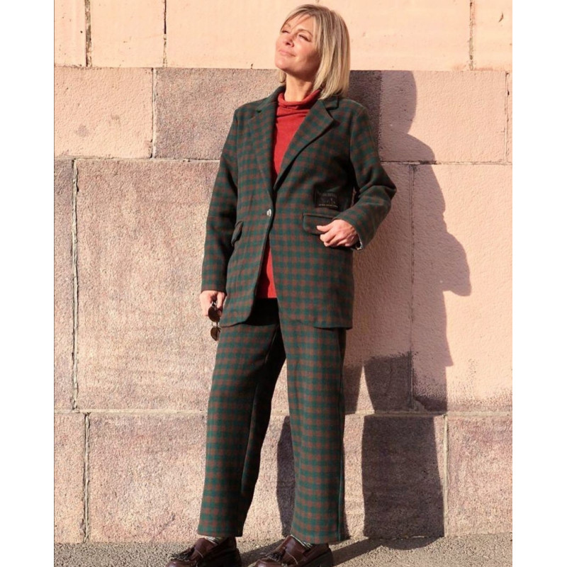 Брючний костюм глибокого кольору морської хвилі з блідою рудою кліткою на красивій віскозній підкладці.Штани прямого крою та оздоблені як чоловічі. Піджак однобортний на 1 гудзик.