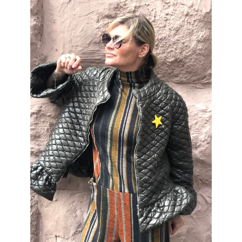 Куртка стьобана укорочена (45см) кольору хакі з воланом по низу та на манжеті. Рукав реглан довжиною 3/4