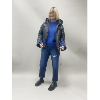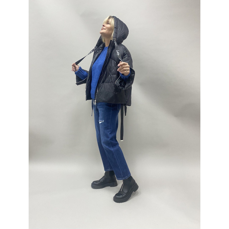 Куртка з натуральног пуху з капюшоном трохи вкорочена спереду. На капюшоні стрчки.Рукава від краю вставлені застібки що виглядає оригінально, зручно одягати. Попереду дві косі прорізні кишені.