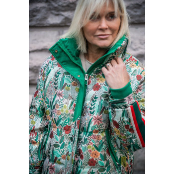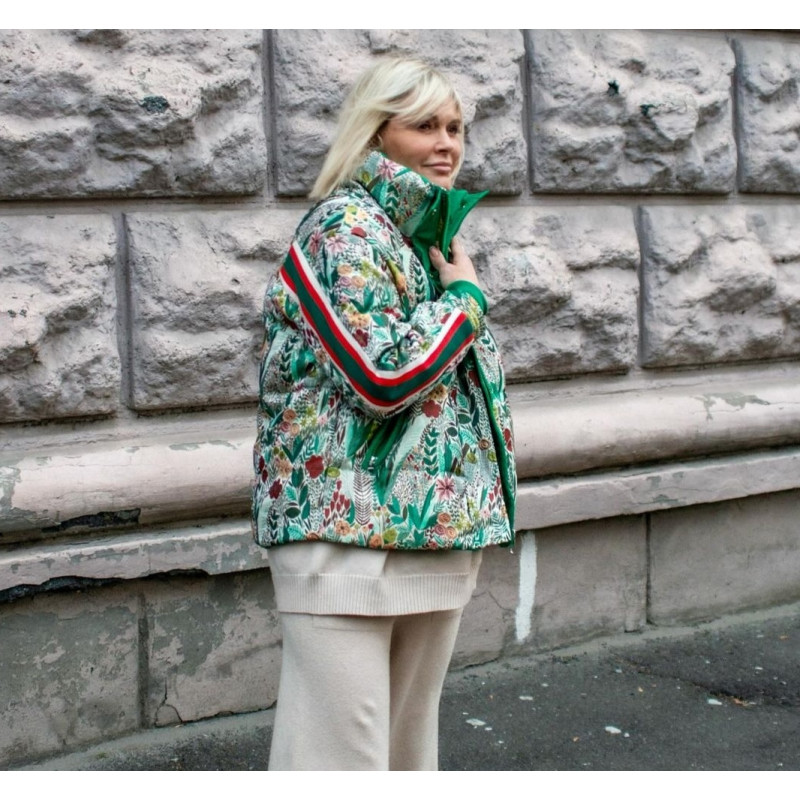 Куртка з натурального пуху із яскрравої гобеленової тканини з коміром стійкою та на блискавці та кнопками . Куртка прикрашена спортивними яскравими смугами лампасами . Весь образ виглядає яскравим та особливим.