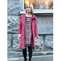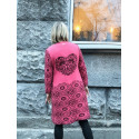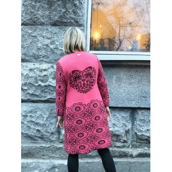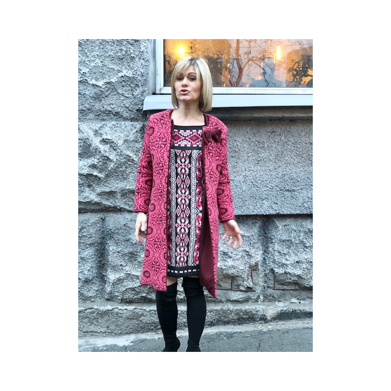 Пальто в'язане з контрастним орнаментом та бантом без коміра, з кишенями у бокових швах