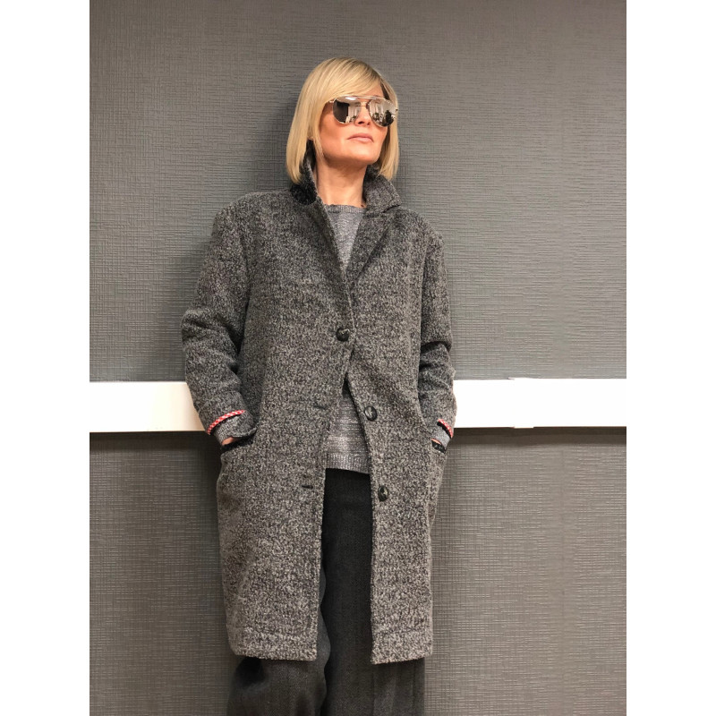 Пальто прямого силуету з відкладним коміром, на трьох великих ґудзиках, доповнене кишенями з клапанами