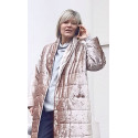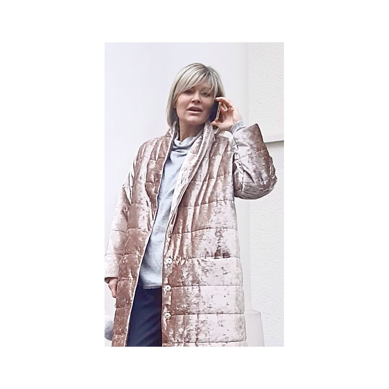 Стьобане пальто з велюру неймовірно кремово-пудрового кольору з мармуровим відливом.
