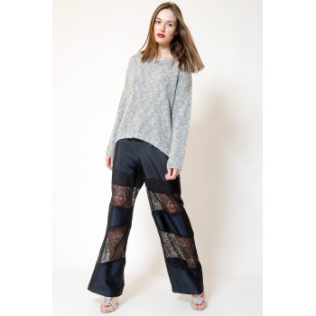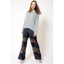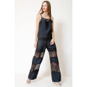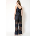 Штани в піжамному стилі, широкі донизу, з поперечними вставками з мережива та еластичним поясом на гумці