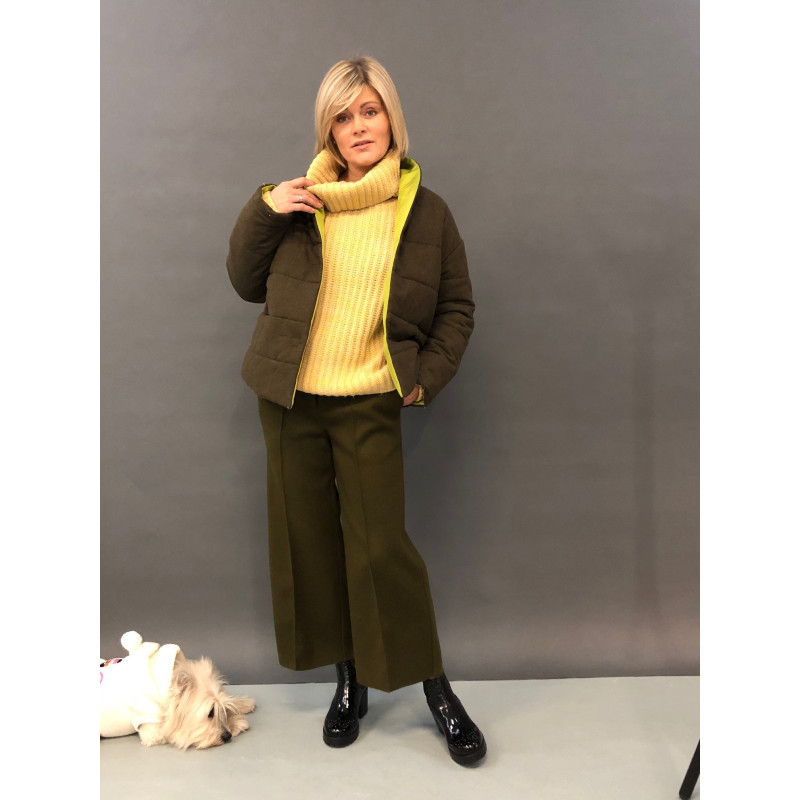 Кюлоти кольору хаккі із змішаної пальтової тканини на трикотажній основі. У кюлот відстрочена стрілка, 2 бічні косі кишені, пояс зі шлейками під ремінь