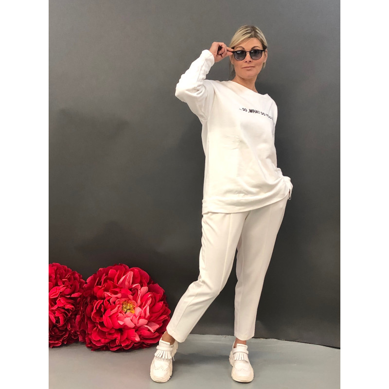 Штани із щільного трикотажу джерсі, звужені донизу, зі швом спереду, з поясом на широкій резинці та косими кишенями