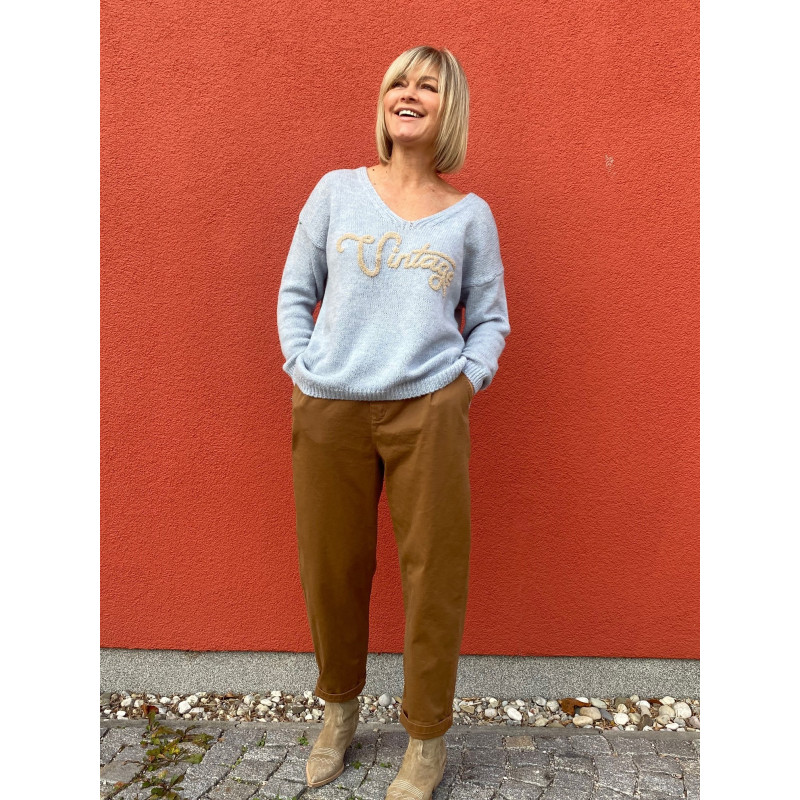 MOM JEANS – модний крій джинсів цього сезону. Стандартний крій на рівні ременя, косі кишені, складки спереду, резинка на поясі ззаду. Джинси вільні по нозі, штанів манжета доповнює картину.