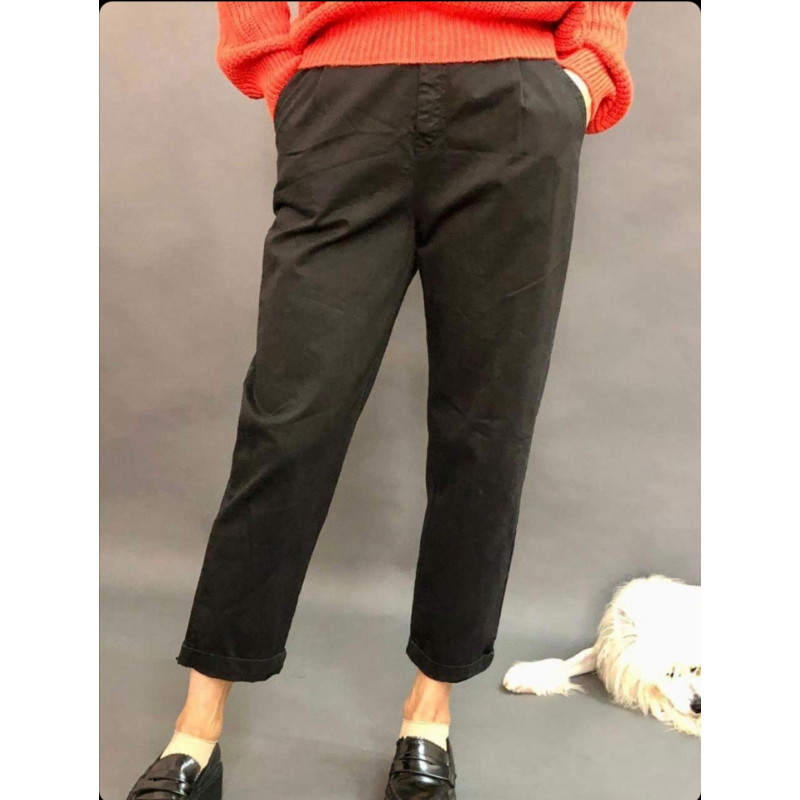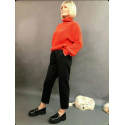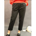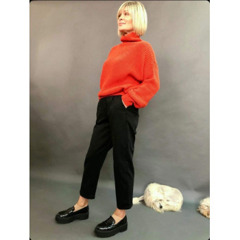 MOM JEANS – модний крій джинсів цього сезону. Стандартний крій на рівні ременя, косі кишені, складки спереду, резинка на поясі ззаду. Джинси вільні по нозі, штанів манжета доповнює картину.