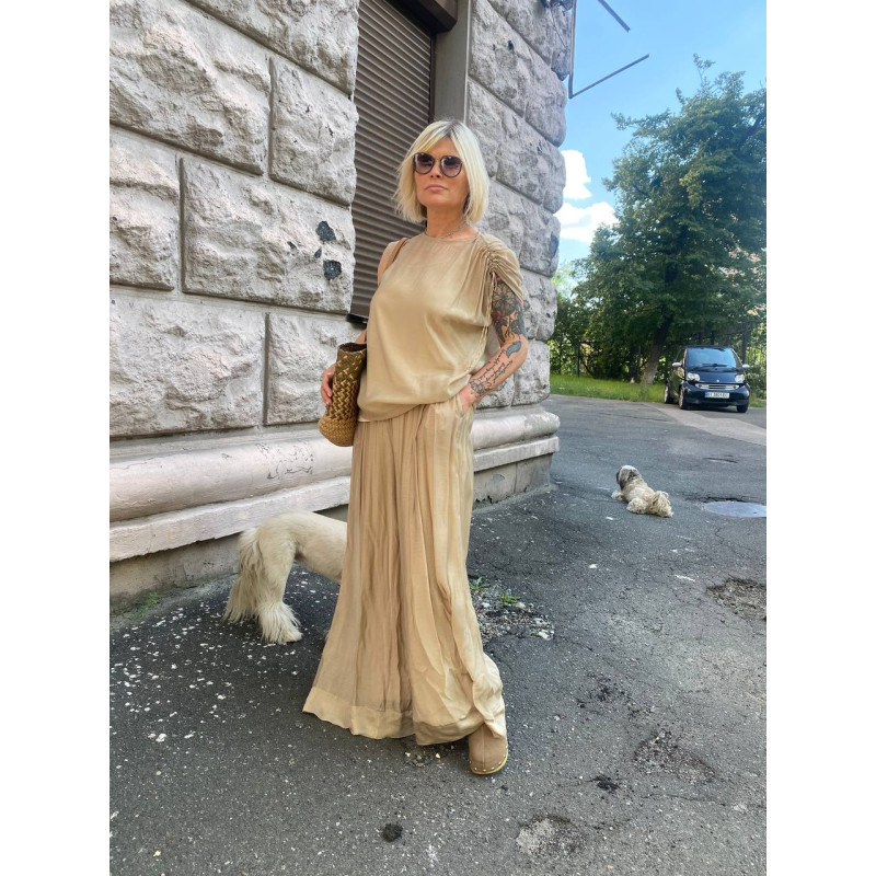 Широкі брюки палацо із віскози з евкаліптового волокна зовні дуже схожі на шовк .