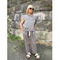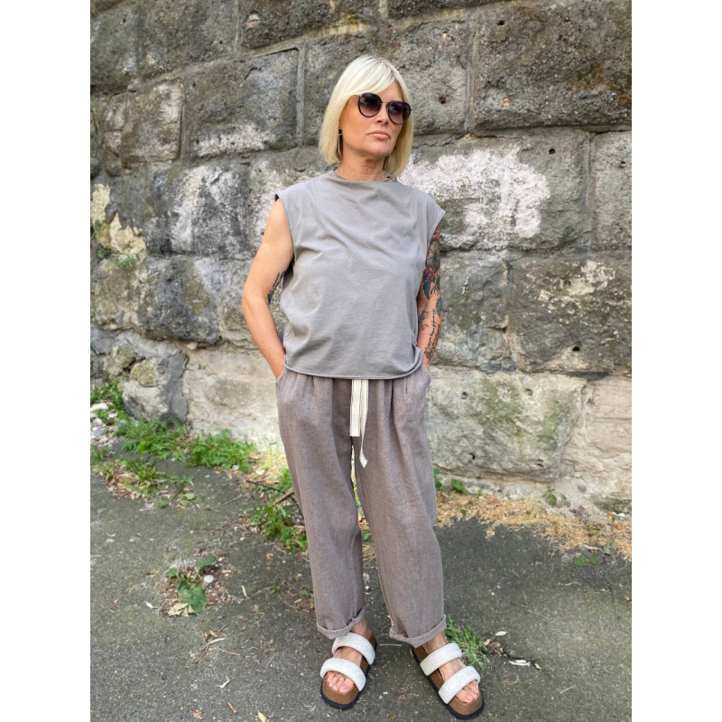 Легкі штани з льону на резинці з кремовим поясом. Бавовна 70% Льон 30%. Кишені - крій аристократа, довжина 92 см. Талія 72-110 см, стегна до 140 см