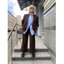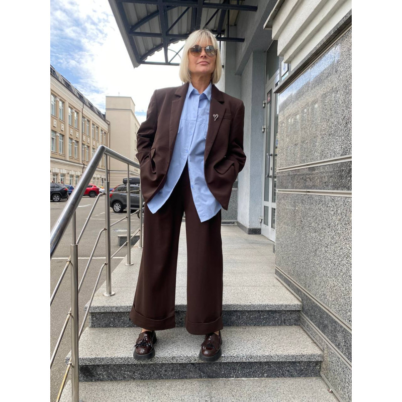 Оригінальний довгий піджак злегка приталений з подвійними клапанами та широкі злегка укорочені штанни з манжетами. Поеднує діловий стиль і стилль преппі в модному шоколадному кольорі.