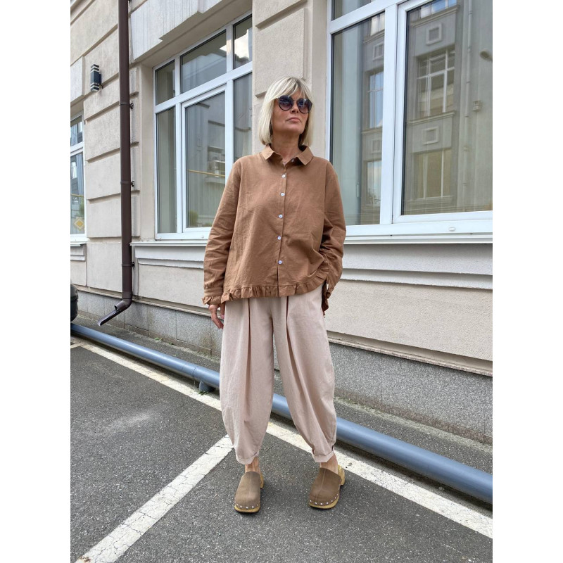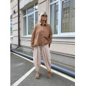 Бавовняні штани з поясом на гумці та з кишенями у бічних швах. До низу штани злегка завужені, по переду защипи складені у зустрічну складку.