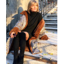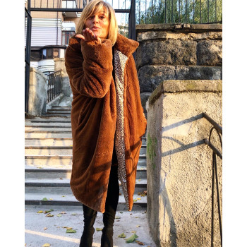 Шуба силует Кокон, приспущена пройма рукава, на рукавах манжети, комір стійка, приховані кишені в швах, на кнопках, двосороняючи на леопардовій підкладці