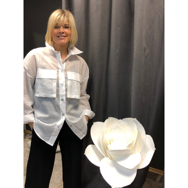 Сорочка вільного крою з двома великими накладними кишенями з клапанами на грудях. Застібається на декоративні перламутрові гудзики
