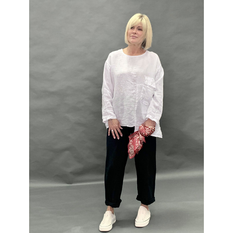 Льняна блуза oversize з довгим рукавом та оригінальним асиметричним силуєтом та великою накладною кишенею.