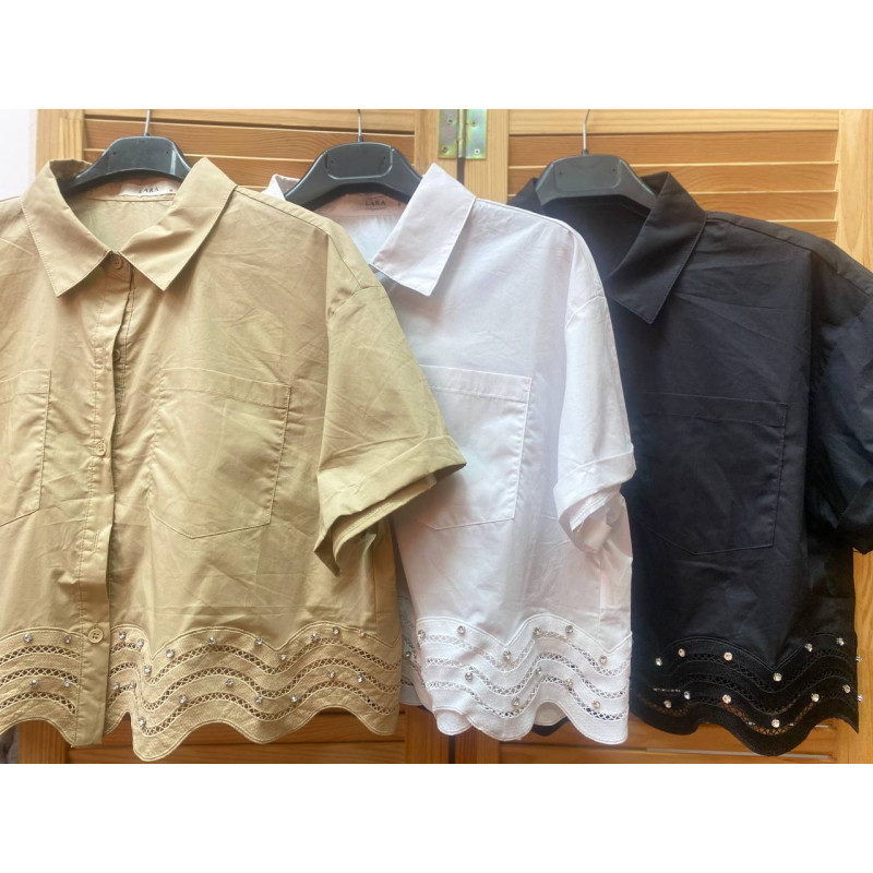 Укорочена сорочка з коротким рукавом та красиво оформленим хвилею подом прикрашеним стразами