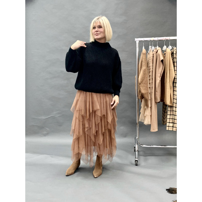Спідниця з тюлі в косі волани з ефектом вареної тканини. Пояс на корсажі. Підкладка з віскози
