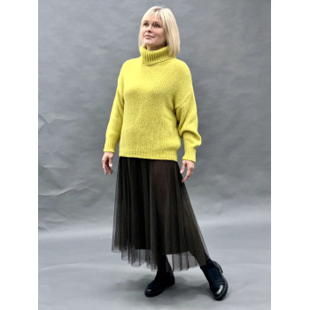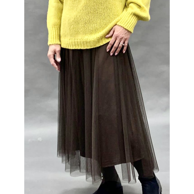 СПІДНИЦЯ з тюлю на підкладці з поясом на гумці, що ллється м'якими красивими фалдами, не додає обсягу, але надає вишуканості і контрасту образу. Особливе задоволення - це рідкісний та глибокий колір гіркого шоколаду!