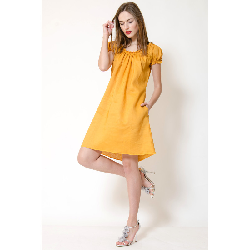 Сукня із льону з короткими рукавами, розкльошений силует, кишені в бічних швах
