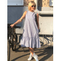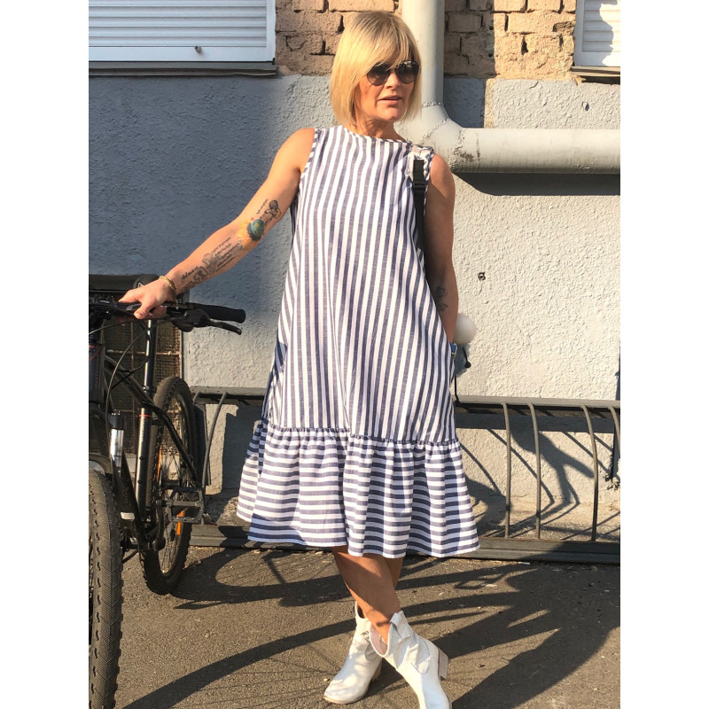 Сукня смугаста без рукавів у формі трапеції, з кишенями в бічних швах та широким воланом по низу