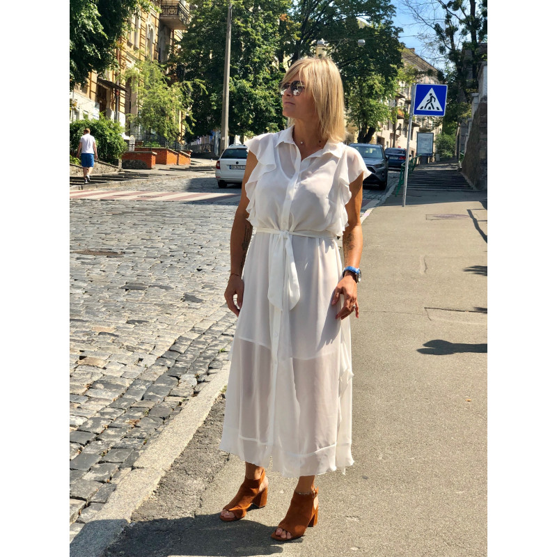 Сукня на підкладці рукав короткий з рюшами попереду планка на ґудзиках з боків шліци з оборкою