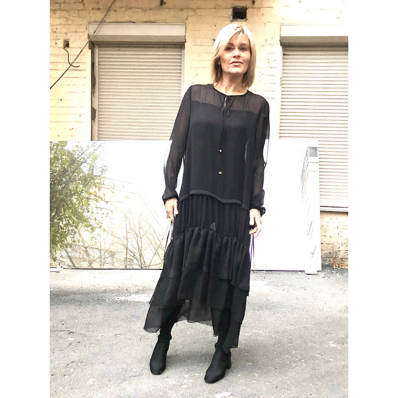 Сукня в стилі бохо, відрізна нижче за талію з великими ярусами воланів і злегка вкороченим передом. воріт і рукави на зав'язках.