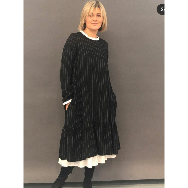 Сукня з чорної бавовни в білу вузьку смугу вільного крою, силуєту трапеція з широкою оборкою по нижньому краю.