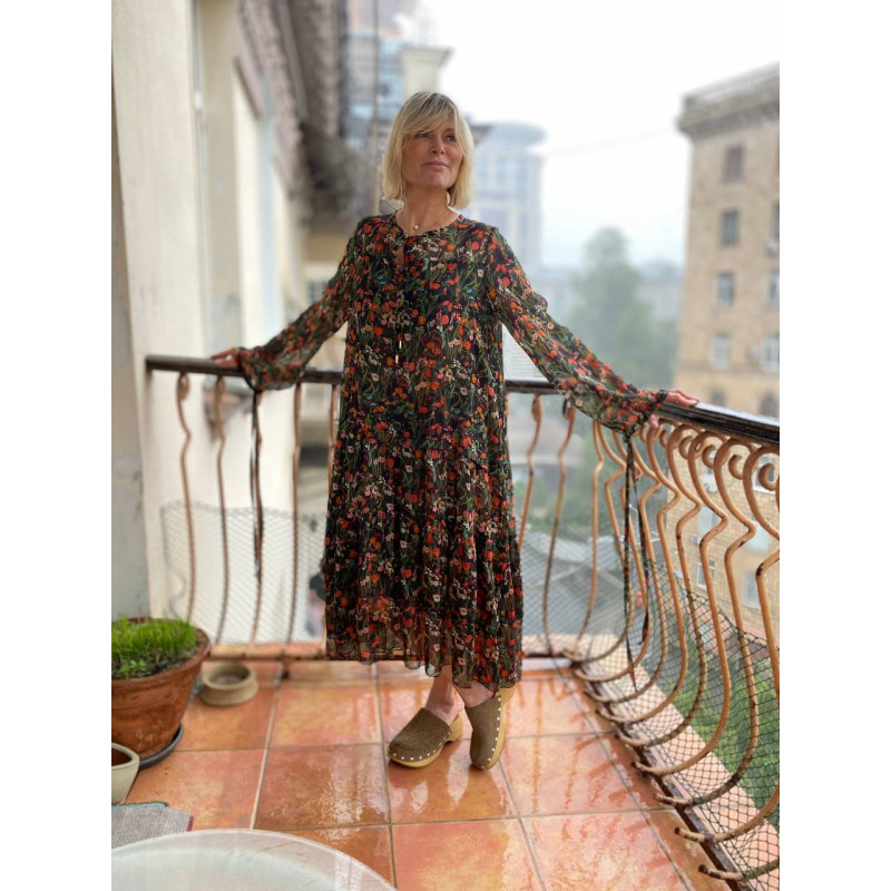 Сукня в стилі бохо, відрізна нижче за талію з великими ярусами воланів і злегка вкороченим передом. воріт і рукави на зав'язках