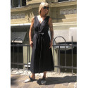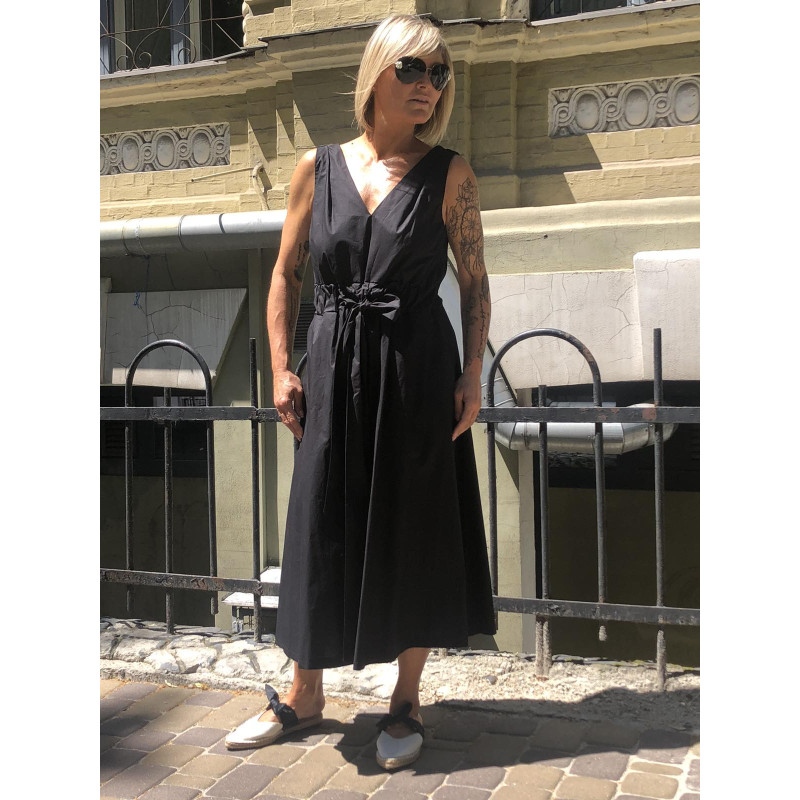 Сукня відрізна по талії без рукава з V-вирізами спереду та ззаду, широкою гумкою на поясі та кишенями в бічних швах ОГ- 108, ОТ - 80, довжина - 122