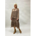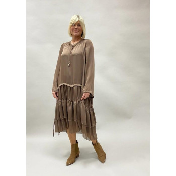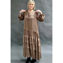 Сукня в стилі БОХО відрізна нижче за талію з великими ярусами воланів і злегка вкороченим передом. комір і рукави на зав'язках
