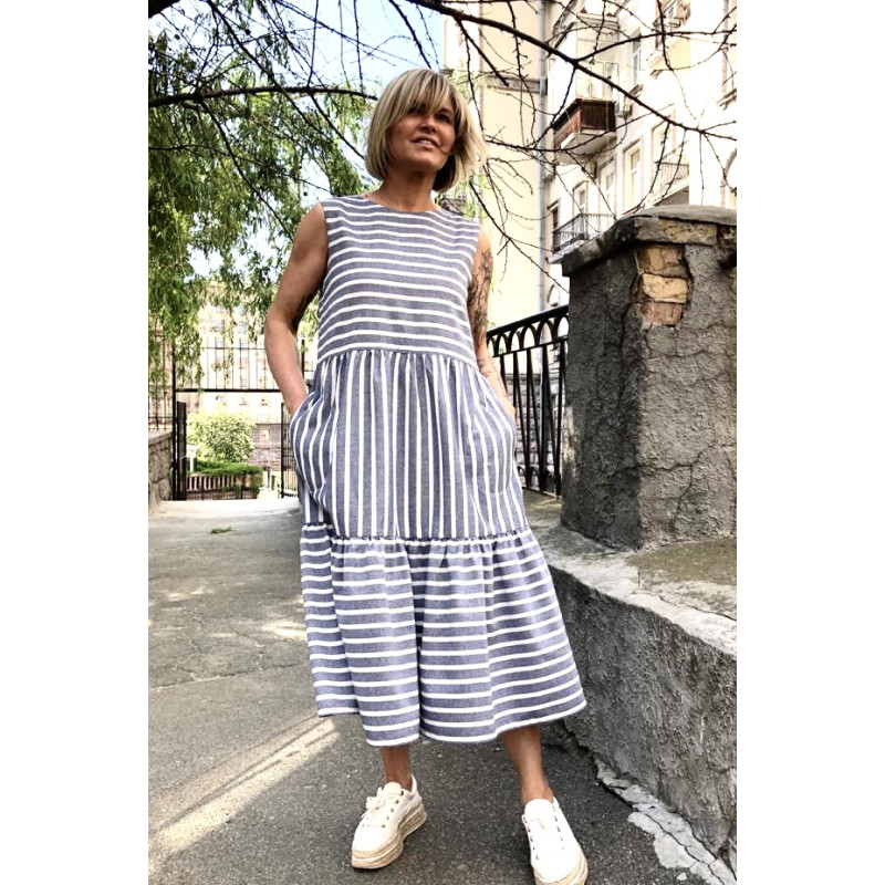 Сукня у блакитну смужку без рукавів у формі трапеції, з кишенями у бічних швах та широким воланом по низу