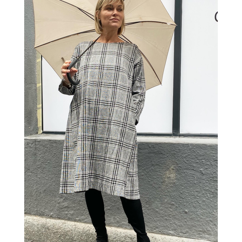 Сукня в чорно-білу клітинку, силует трапеція, з рукавом 3/4 та кишенями у бокових швах