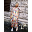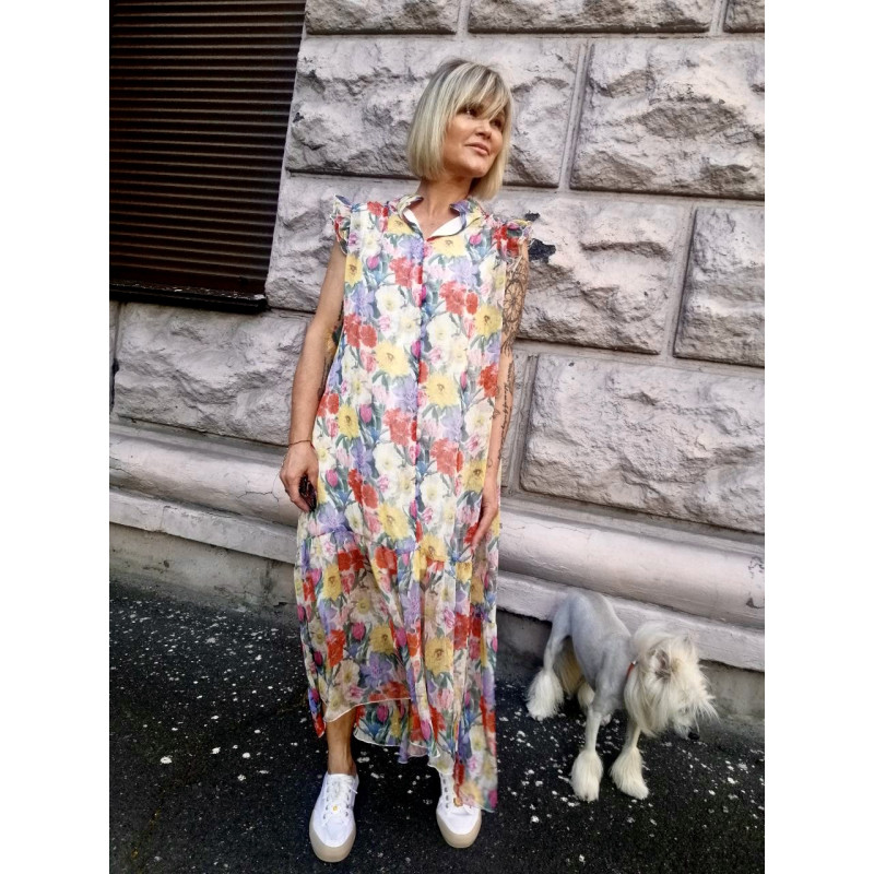 Ніжна повітряна сукня зі штучного жатого шифону на віскозній сукні-підкладці. Злегка укорочений спереду поділ оформлений широким воланом, комір широка стійка, з вирізом спереду, пройм рукавів оформлений подвійним рядом рюшів, і нарешті, дивовижний малюнок квітів як з полотен Матісса роблять цю сукню яскравою та надзвичайно милою