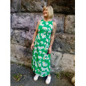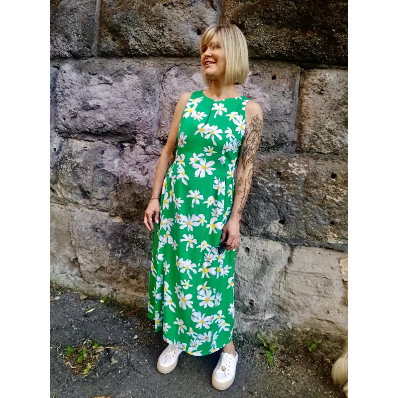 Сукня без рукавів у яскравому зеленому кольорі з ромашками, призбирана під бічними поличками, евкаліптова тканина