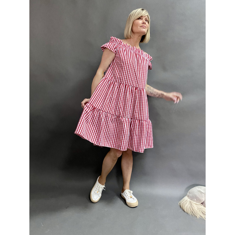 Сукня багатоярусна із спущеною лінією плечей.