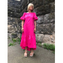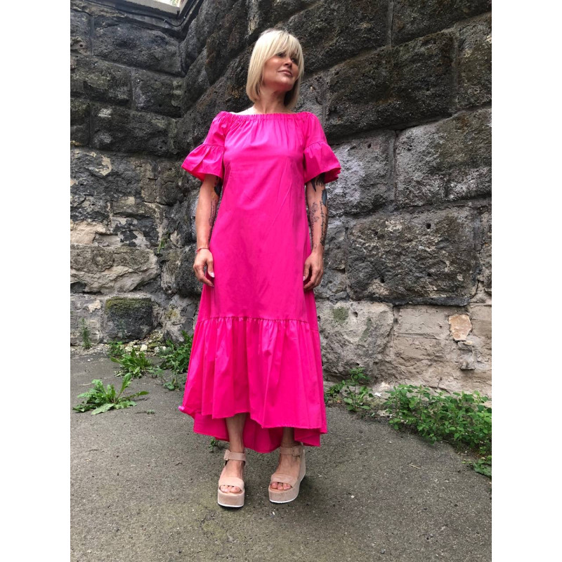 Сукня бавовняна із спущеною лінією плечей та великим воланом внизу.