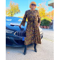 Сукня А-силуету з відкритим вирізом і довгими рукавами, трохи вище за талію стягнута темно-синім оксамитовим шнурком. З його стриманим абстрактним квітковим принтом він незамінний у гардеробі. Якщо ви хочете виглядати струнко, жіночно та елегантно, то це воно!
