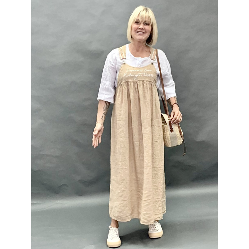 Сарафан із льону на бретельках з друкованим приптом на грудях. Спина оформлена ромбом.