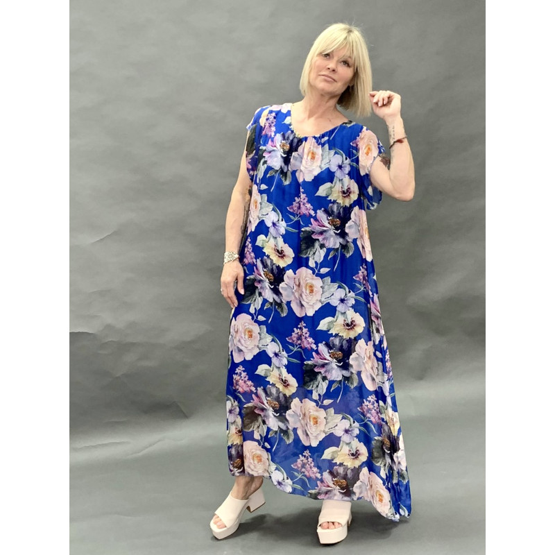Яскрава шовкова сукня в підлогу з великими яскравими квітами. Глибокий виріз горловини . короткий рукав кімоно як крильце надає сукні ще більшого ефекту.