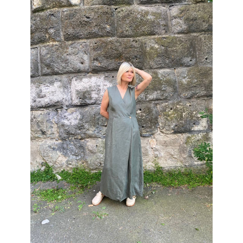 Сукня на запах із якісного льону на двох гудзиках , відрізне по талії, з кишенями у бічних швах .
