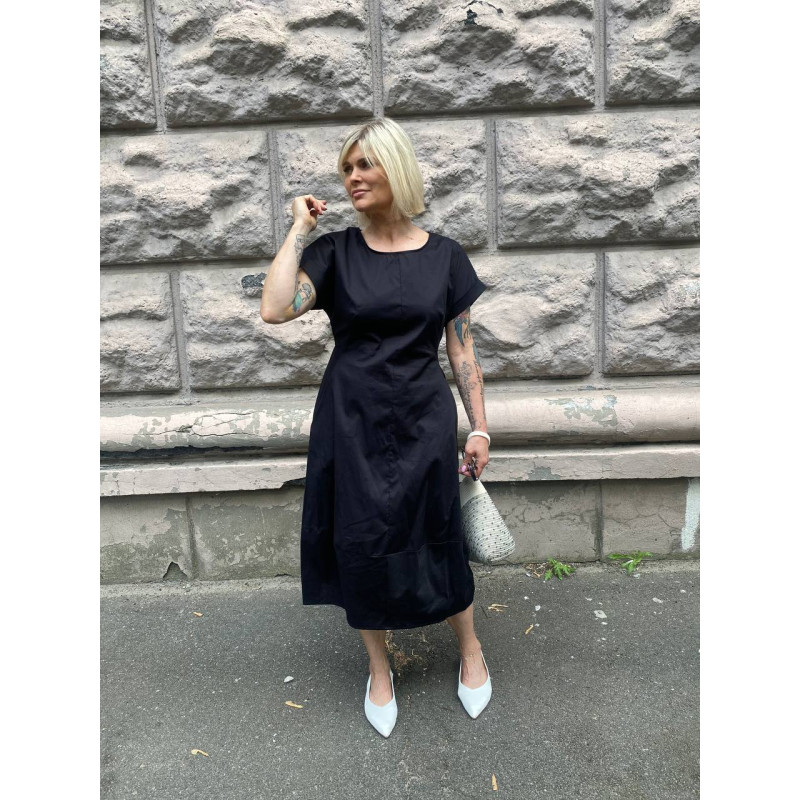 Сукня з попліну відрізна по талії та на резинці позаду, з кишенями у бічних швах . Оригінальні довгі виточки спереду красиво виглядають по фігурі