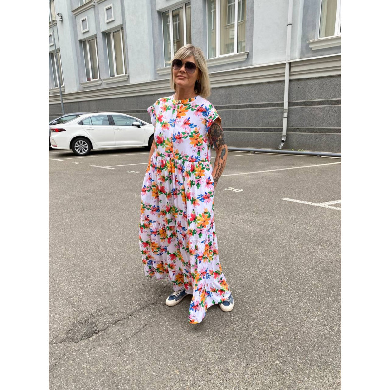 Яскрава літня багатоярусна сукня максі з віскози . Спереду кокетка на гудзиках , кишені у бічних швах.