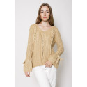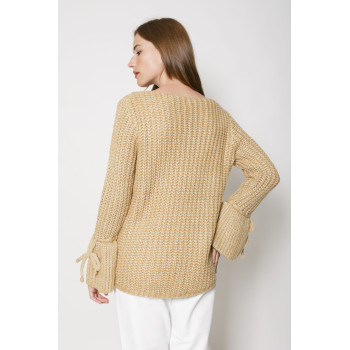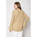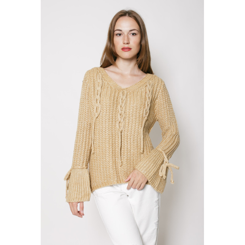 Светр прямого вільного силуету з товстої пряжі з люрексом. Довгі рукави оформлені широкими манжетами та куліскою. V-подібна горловина. Полиця доповнена декоративними в'язаними елементами