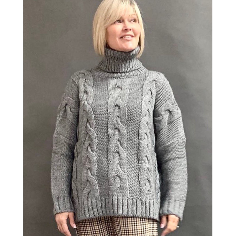 Светр вовняний, в'язаний великою в'язкою з орнаментом "коси" по передній та задній частині. По нижньому краю светра та по манжетах гумка. Високий комір, також, пов'язаний гумкою. Светр виконаний у стилі "оверсайз".